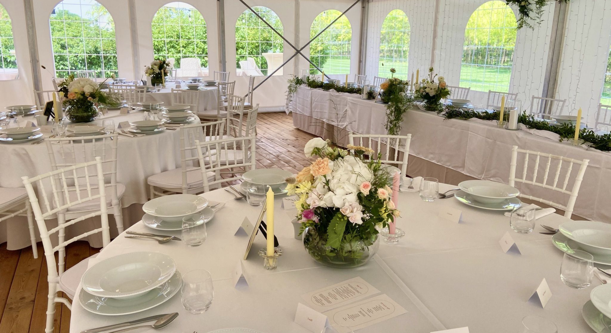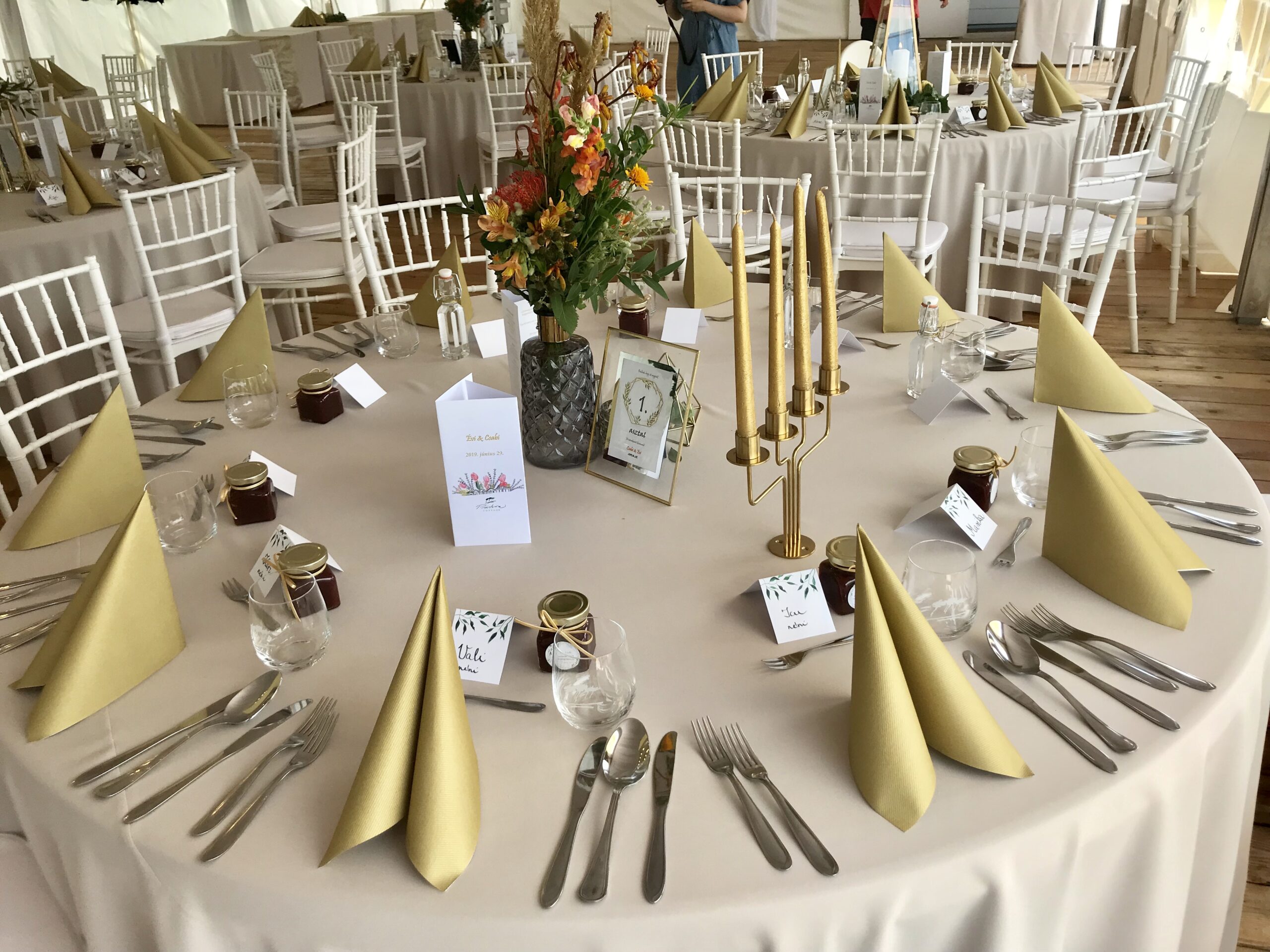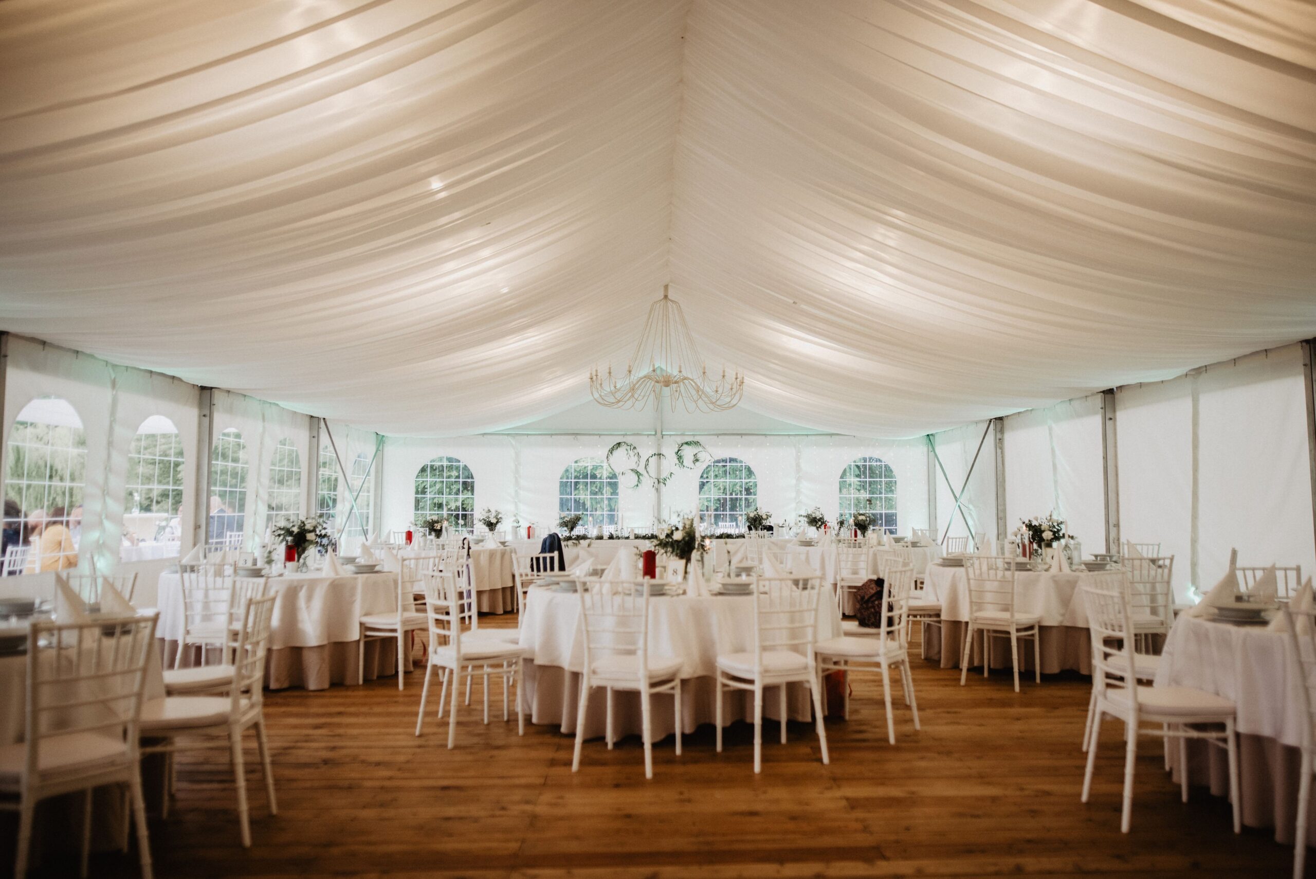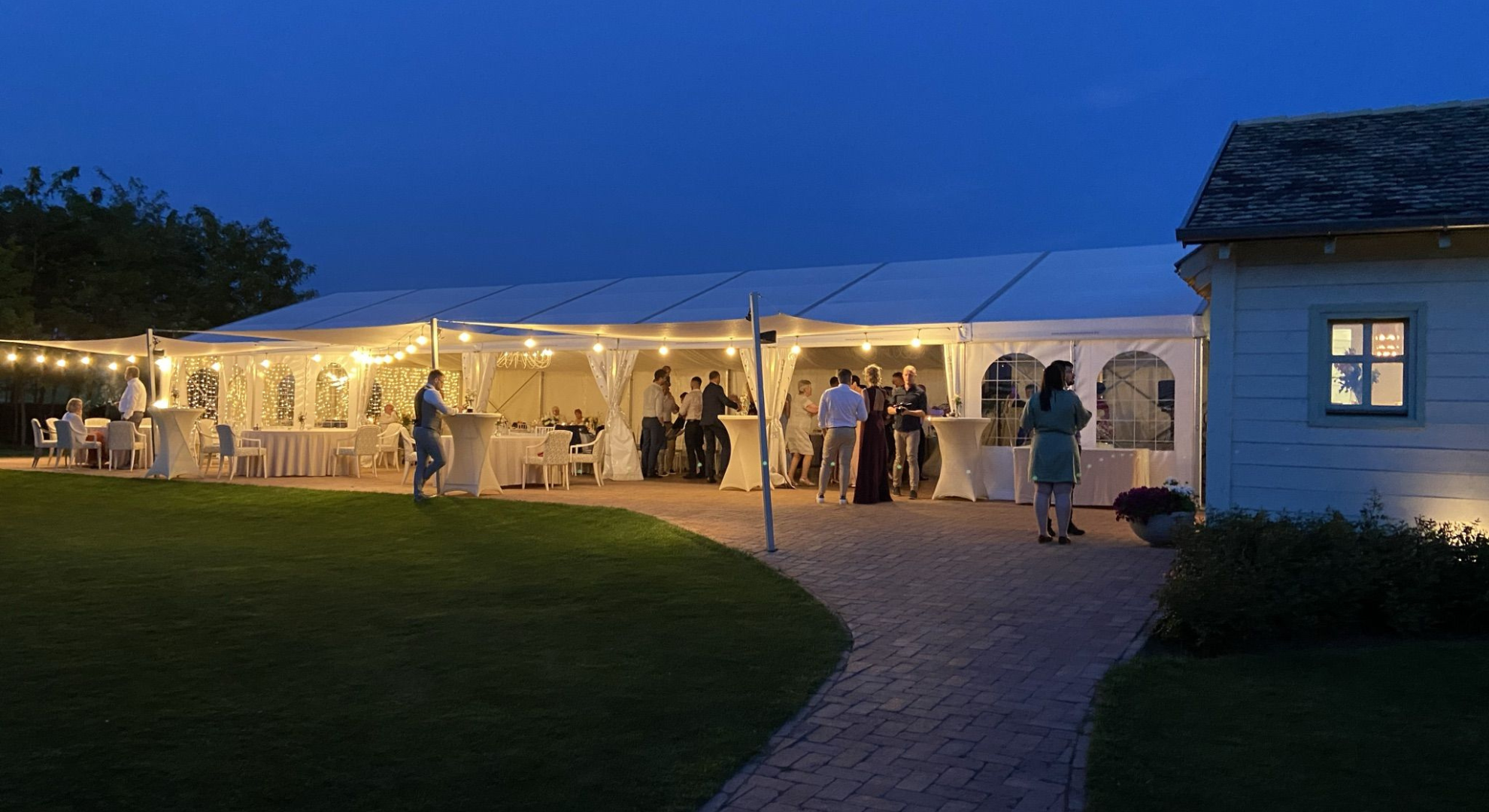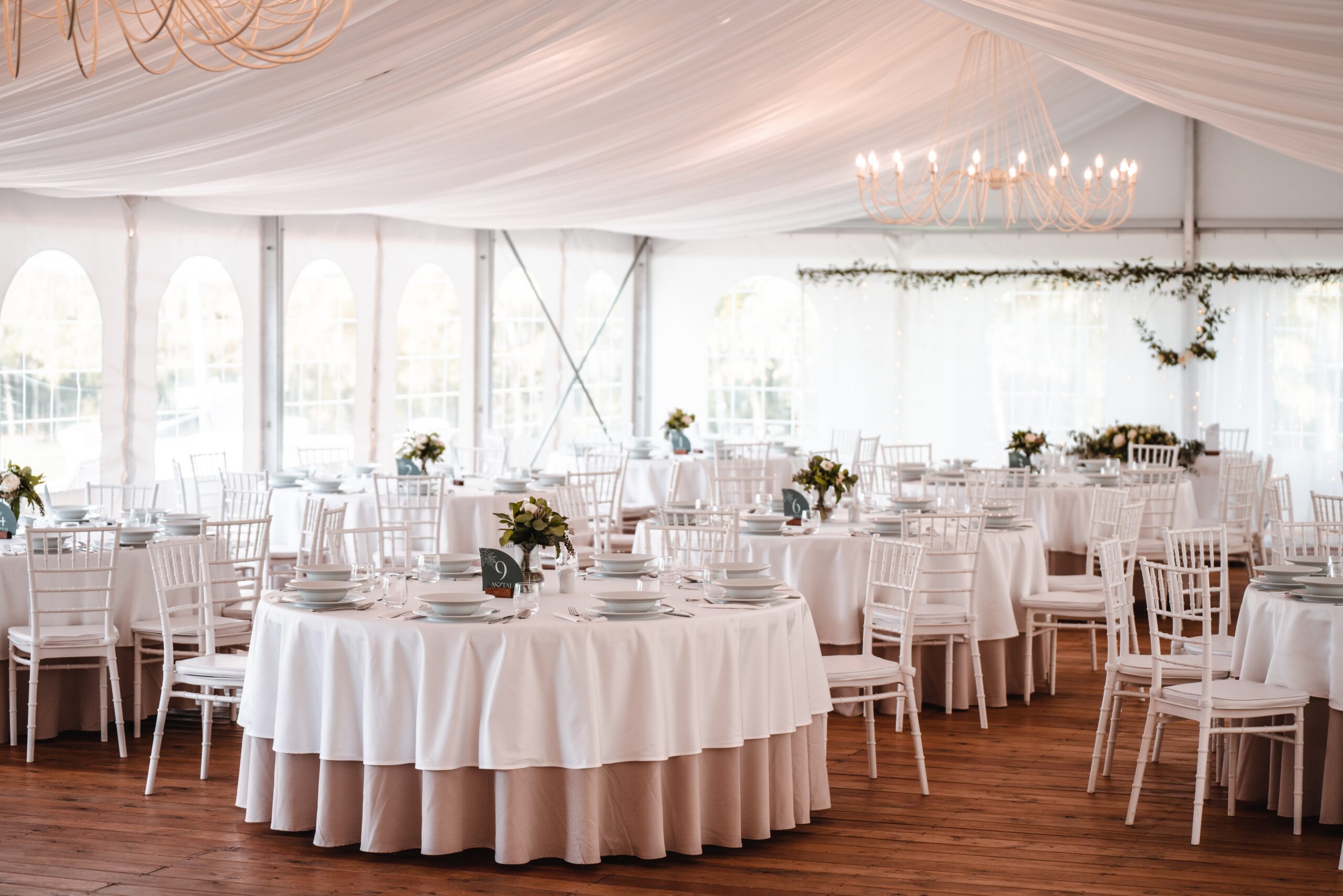 Felszereltsége: 12 db 180 cm átmérőjű körasztal (10-11 fő/asztal), fehér Chiavari székekkel, 6 db könyöklővel, 12 db bankett asztal, földig érő terítők minden asztal típushoz, a vendéglátáshoz szükséges teljes eszközfelszerelés, porcelán tányérok, minőségi üvegpoharak, textil hatású szalvéta, 2 db 20 ágú, nagyméretű egyedi csillár, 12 db háttérvilágító lámpa, vörösfenyő padozat és a sátorhoz tartozó férfi, női mosdó. A rendezvényhelyszín mennyezeti fehér selyem dekorral ellátott. Igény esetén oldalfalak és asztalok dekorálása lehetséges a megrendelő igénye szerint, melyhez ajánljuk együttműködő partnereinket vagy az önök által szabadon választott szolgáltatót. Kérjük Önöket, hogy a vendégház parkjában csak növényi eredetű sziromszórás történjen. A rendezvényhelyszín előre egyeztetett korább időpontban az esküvő szervezői (dekoratőrök) tudják már díszíteni. A rendezvényhelyszín díja: 600000,- Ft/alkalom.