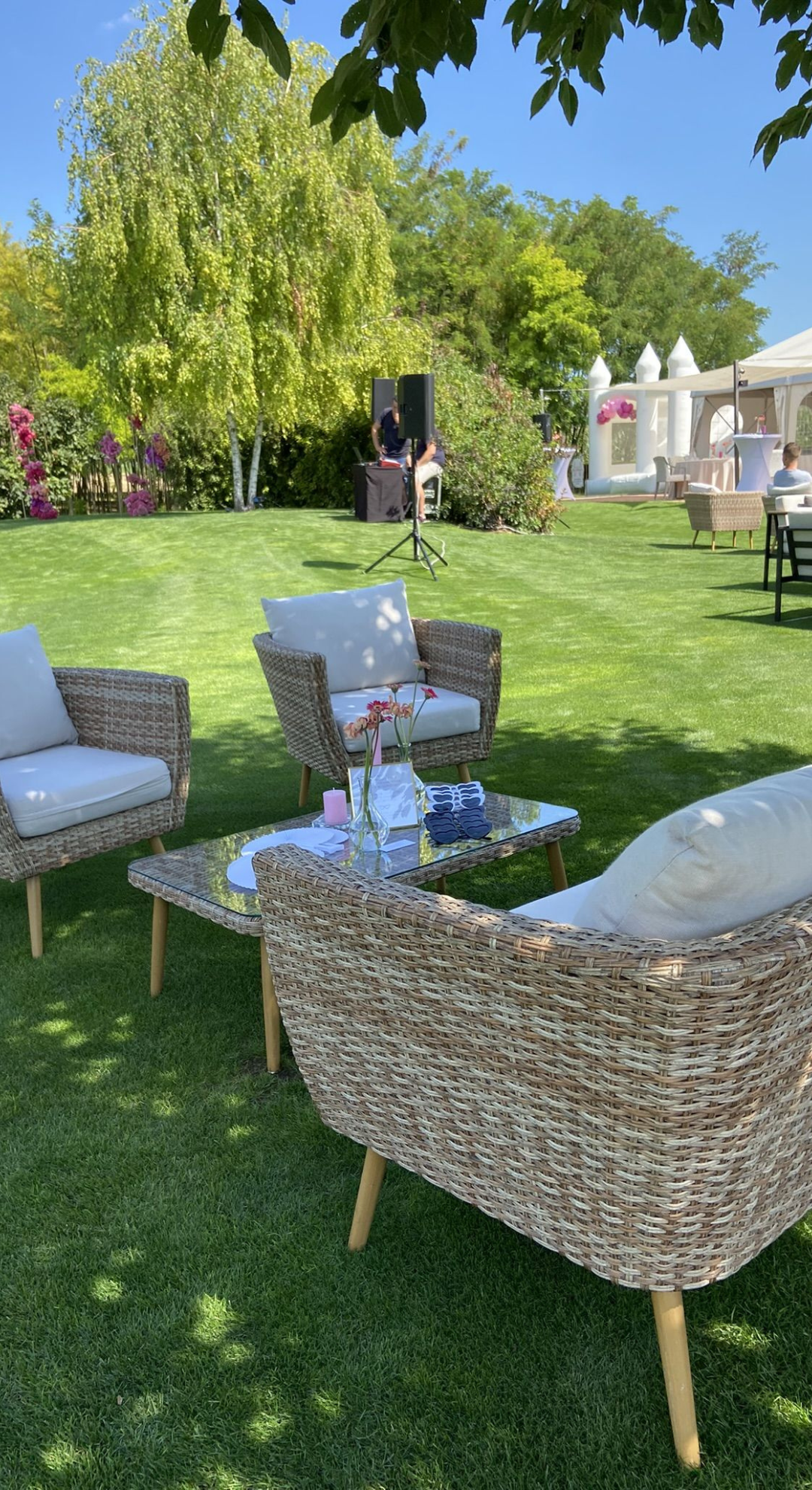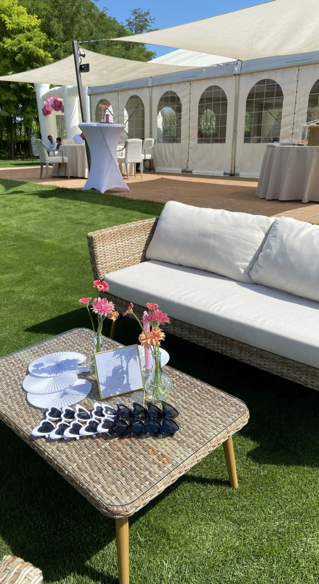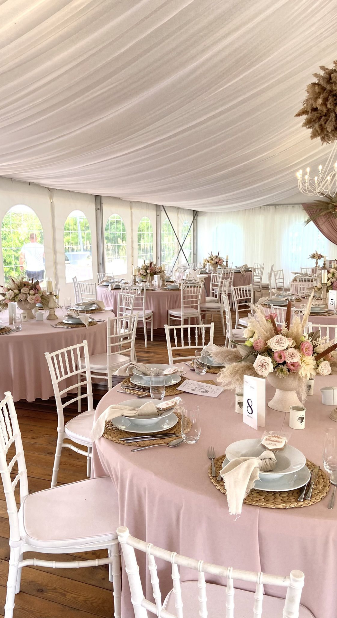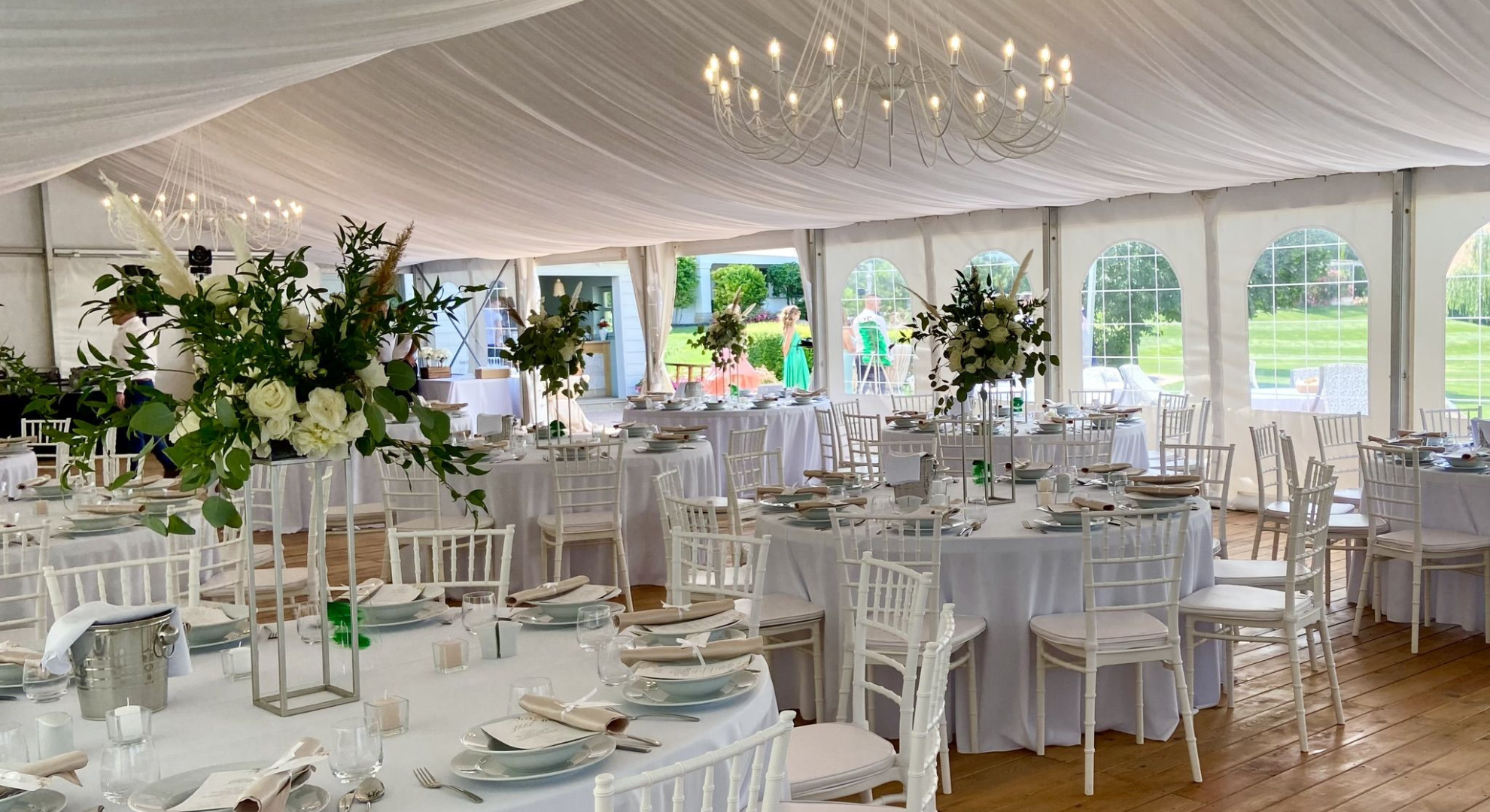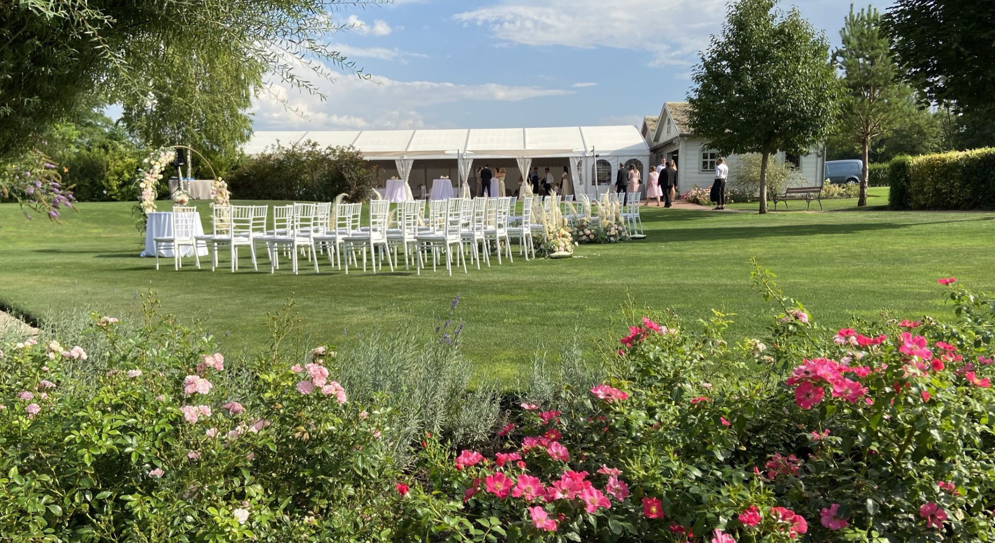 Felszereltsége: 12 db 180 cm átmérőjű körasztal (10-11 fő/asztal), fehér Chiavari székekkel, 6 db könyöklővel, 12 db bankett asztal, földig érő terítők minden asztal típushoz, a vendéglátáshoz szükséges teljes eszközfelszerelés, porcelán tányérok, minőségi üvegpoharak, textil hatású szalvéta, 2 db 20 ágú, nagyméretű egyedi csillár, 12 db háttérvilágító lámpa, vörösfenyő padozat és a sátorhoz tartozó férfi, női mosdó. A rendezvényhelyszín mennyezeti fehér selyem dekorral ellátott. Igény esetén oldalfalak és asztalok dekorálása lehetséges a megrendelő igénye szerint, melyhez ajánljuk együttműködő partnereinket vagy az önök által szabadon választott szolgáltatót. Kérjük Önöket, hogy a vendégház parkjában csak növényi eredetű sziromszórás történjen. A rendezvényhelyszín előre egyeztetett korább időpontban az esküvő szervezői (dekoratőrök) tudják már díszíteni. A rendezvényhelyszín díja: 600000,- Ft/alkalom.