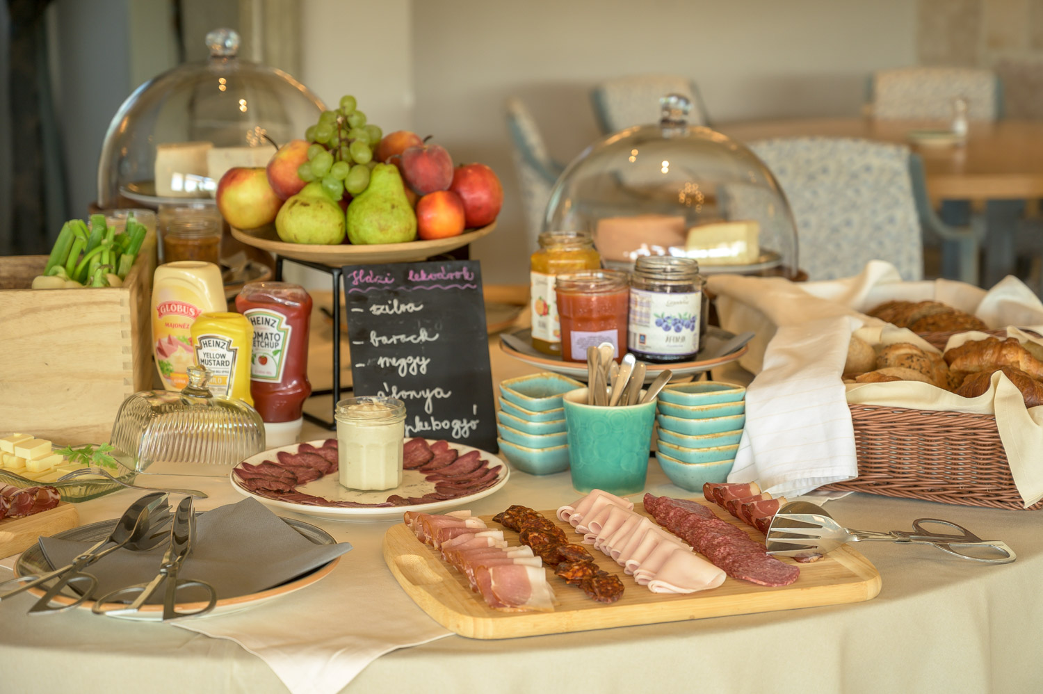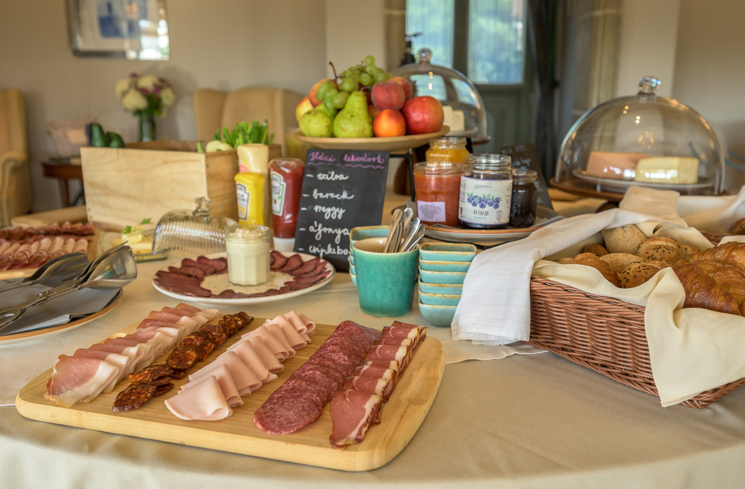 Saláták, savanyúságok (Vacsora ideje alatt büféasztalról): 1 fajta zöldsaláta, Idény szerinti vegyes vágott savanyú