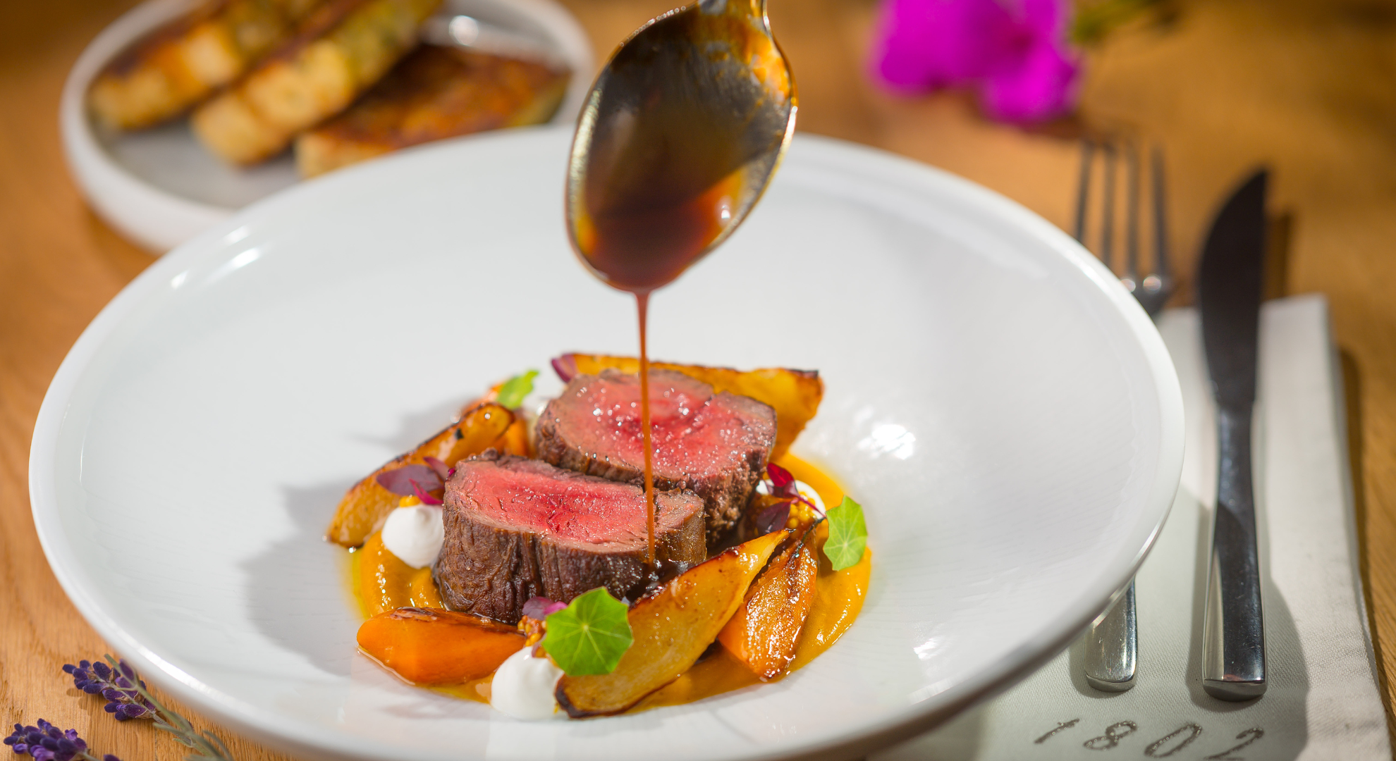 Őz filé ”Cumberland”, krémes paszternák, lemezes burgonya, sütőtök