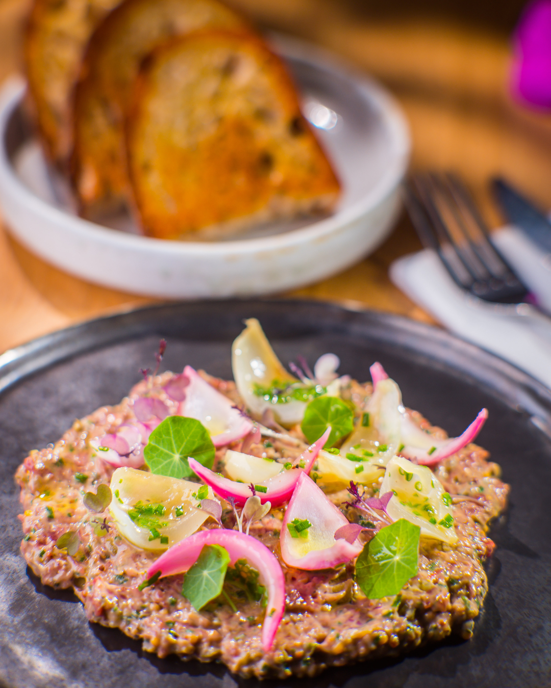 USDA Marha chuk flap steak, füstös paszternák krém, ropogós hagyma, szalonna jus